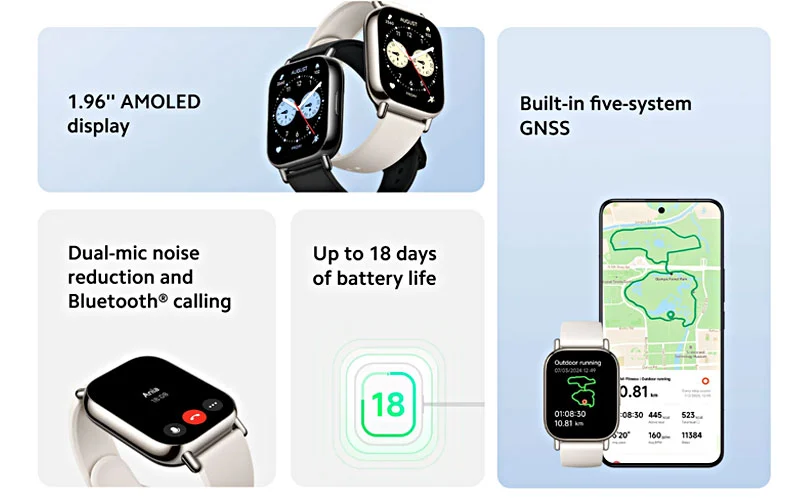 • Batería de larga duración: Con una capacidad de 470 mAh, ofrece hasta 18 días de autonomía en uso normal, 12 días en uso intensivo y 7 días con la función AOD activa, asegurando un rendimiento prolongado sin preocupaciones.