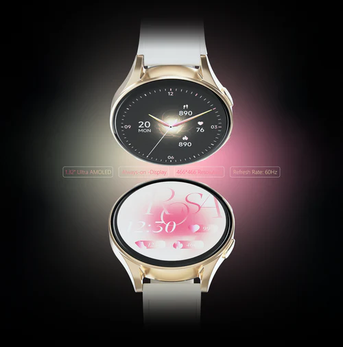 Udfine Watch Rosa es un elegante reloj inteligente que combina diseño sofisticado con funcionalidades avanzadas. Su pantalla AMOLED de 1.32 pulgadas ofrece colores vibrantes y una resolución de 466×466 píxeles, garantizando una experiencia visual excepcional.